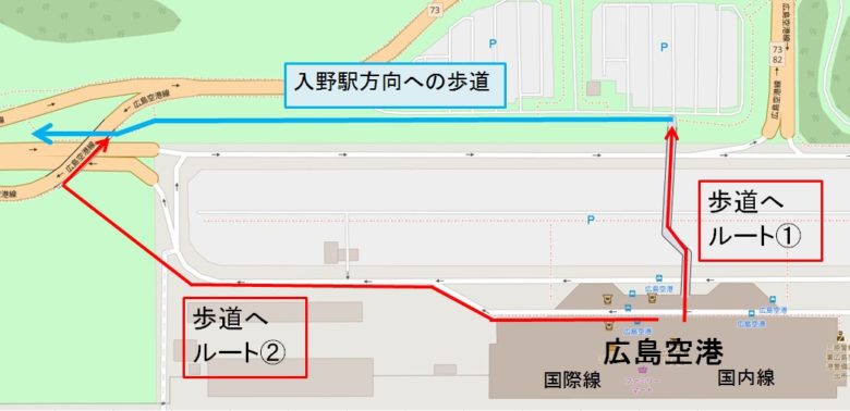 Google mapで調べた所、空港前の県道73号線沿いにある歩道を進むようなのですが、その歩道に出る方法がよくわかりませんでした。